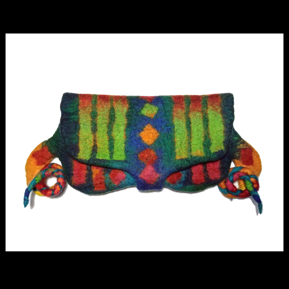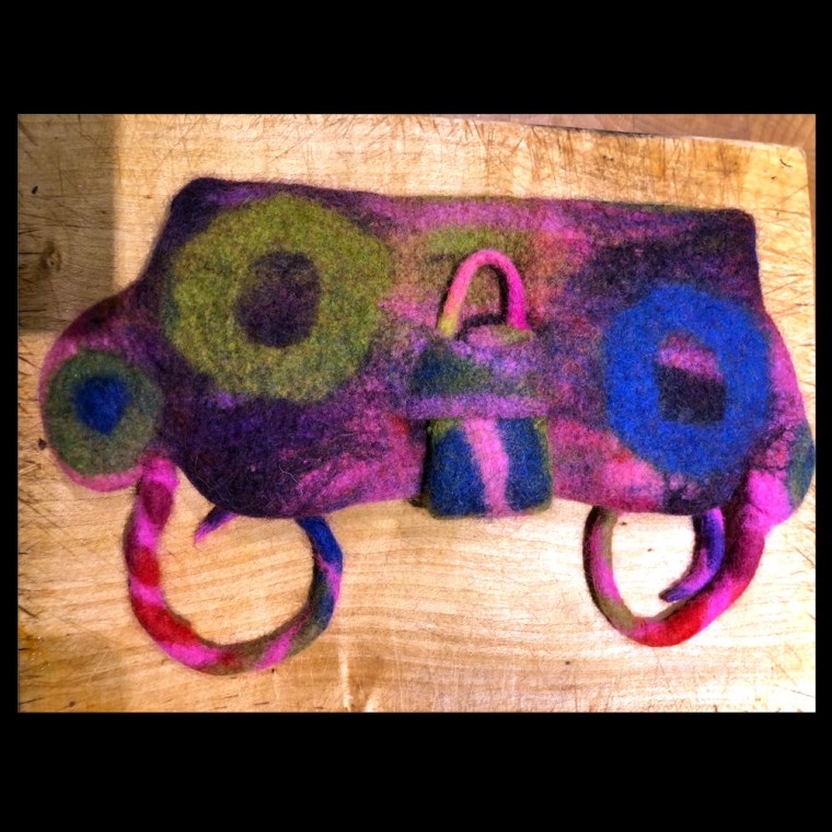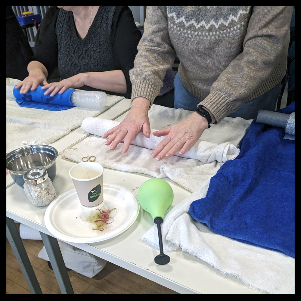 In the morning, beginner wet feltmakers will learn how to lay out wool using a flat 10-inch template and how to felt, full, and shrink. We will look at the graduation of colour and shrinkage rates.