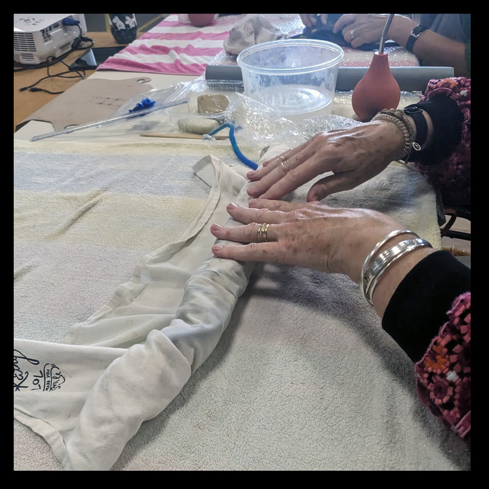 Some students share their still-in-process, wet-felted eyeglass cases created during a hybrid workshop with Judit Pocs. From left to right: Clodagh, Siobhan, Breda, Dee, Adrienne, Elizabeth, and Hรฉlรจne.