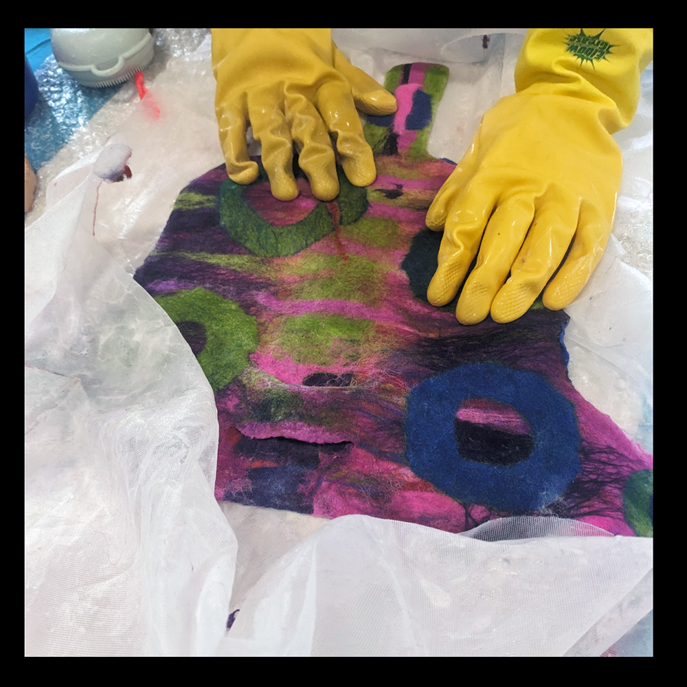 Once the decorative layers were arranged, the pieces were wetted down and lightly felted so the fibres began to intermingle and bond.