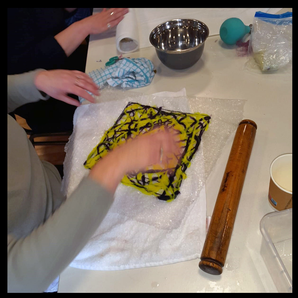For the workshop, students could use deliciously coloured Merino wool kits from Feltmakers Ireland and Design and Crafts Council (DCCI) member Leiko Uchiyama (https://www.leikofelt.com/shop/) or fibre from their own stashes.