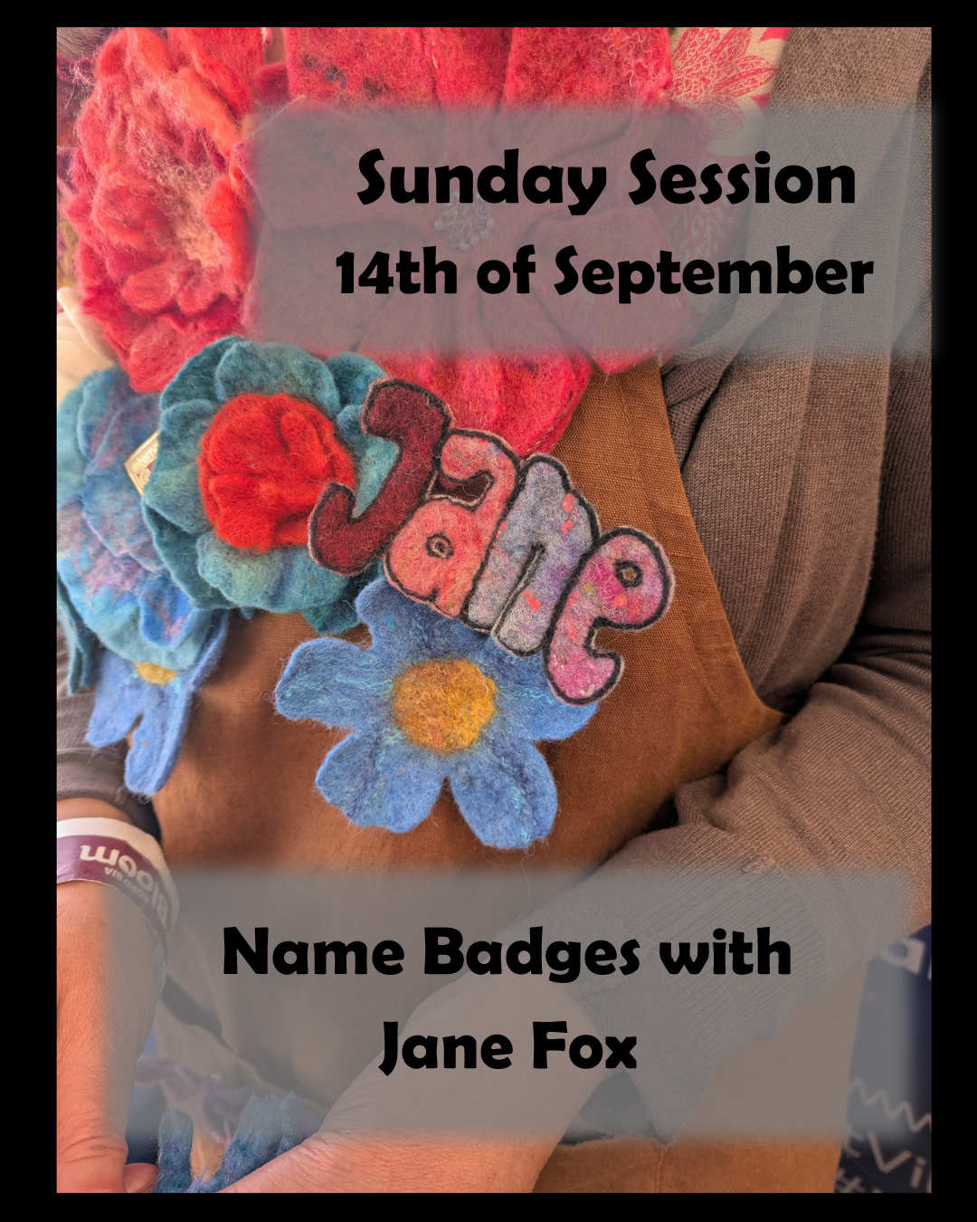 Guild memberย Jane Foxย will lead us in creating our own Name Badges. The photo shows her badge, which she wore to demonstrate at this year’s Bloom. It is both beautiful and sustainable, and combines wet felting with needle felting!